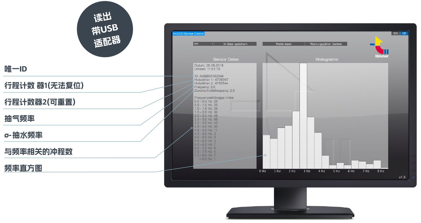 該USB適配器能夠讀取智能感測器存儲的數據。通常,這種情況發生在應用/生產之外(例如車間)。此適配器只能在防爆區域之外使用。 使用我們的tim?LINK泵監測系統,可以在運行過程中即時傳輸和讀取運行數據。